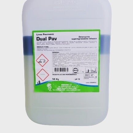 DUAL PAV - Detergente bifasico ad elevata attività sgrassante ph13. Indicato per la pulizia di superfici con sporco ostinato, pavimentazioni industriali, officine e industrie meccaniche, industrie alimentari e lattiero-casearie, macelli e mattatoi!